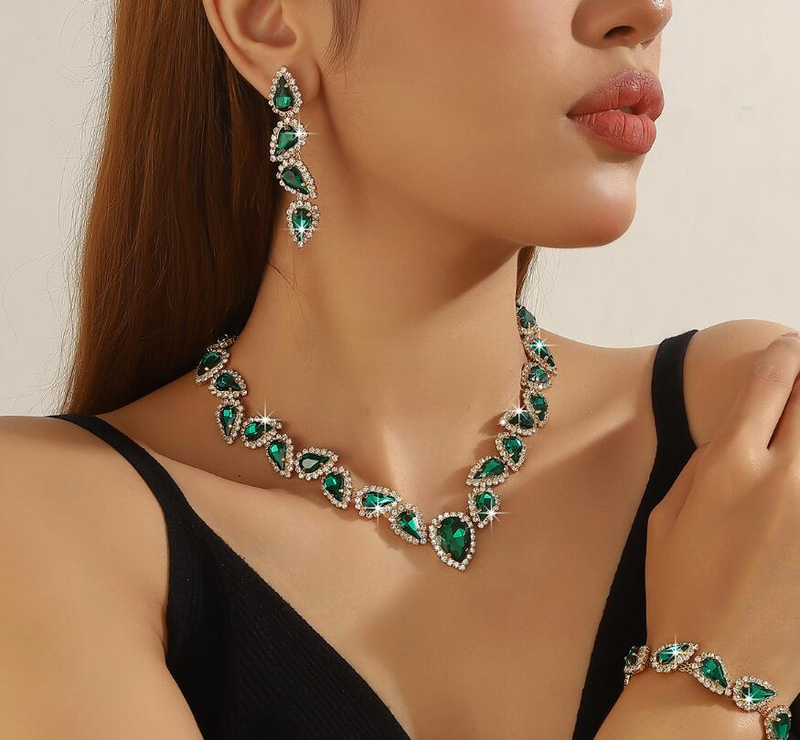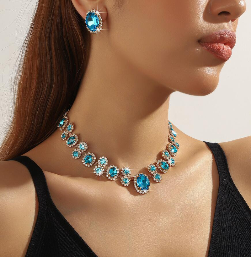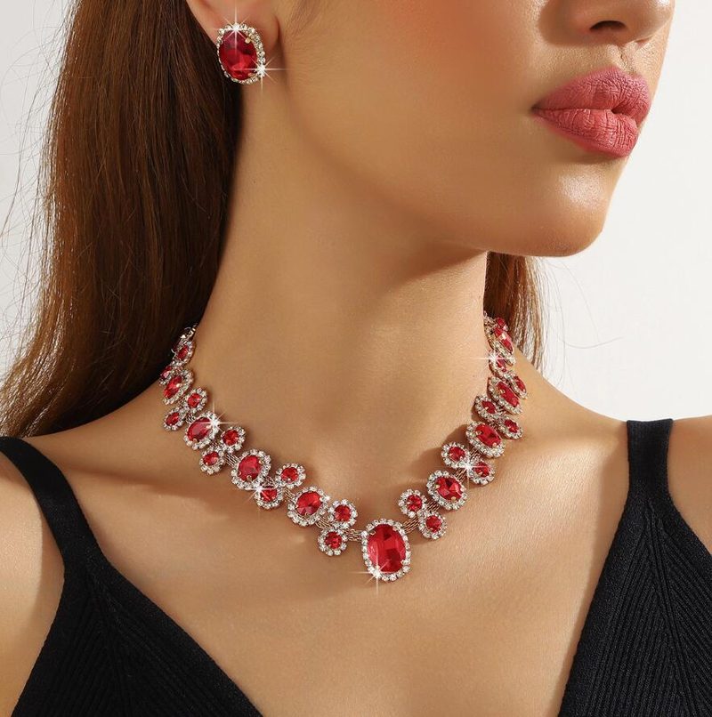 Exaggerated color geometric full-diamond crystal necklace and earrings set