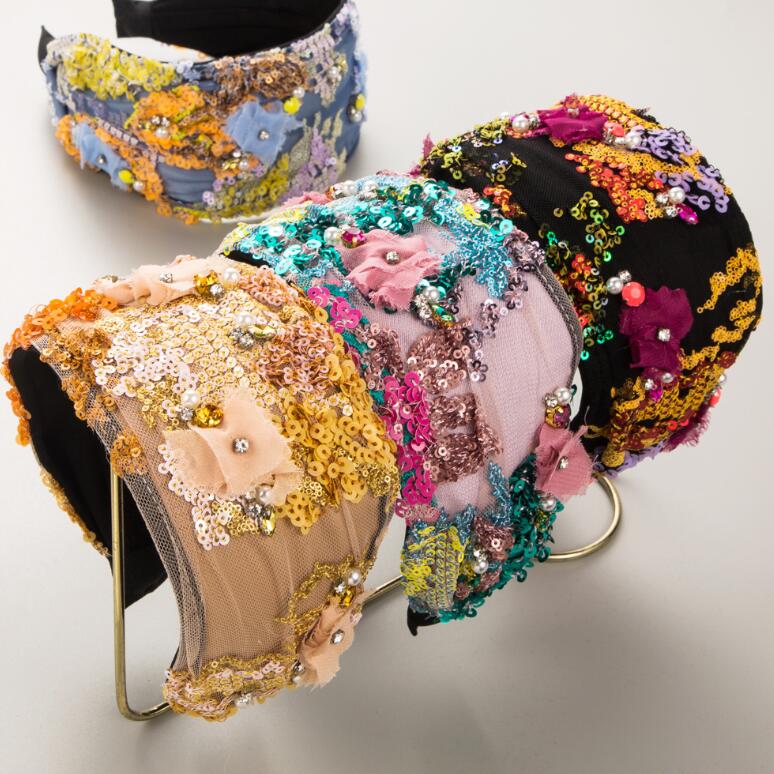 American style ultra-wide multi-color striped sequin hairband with elegant and individualistic lace flower embroidery