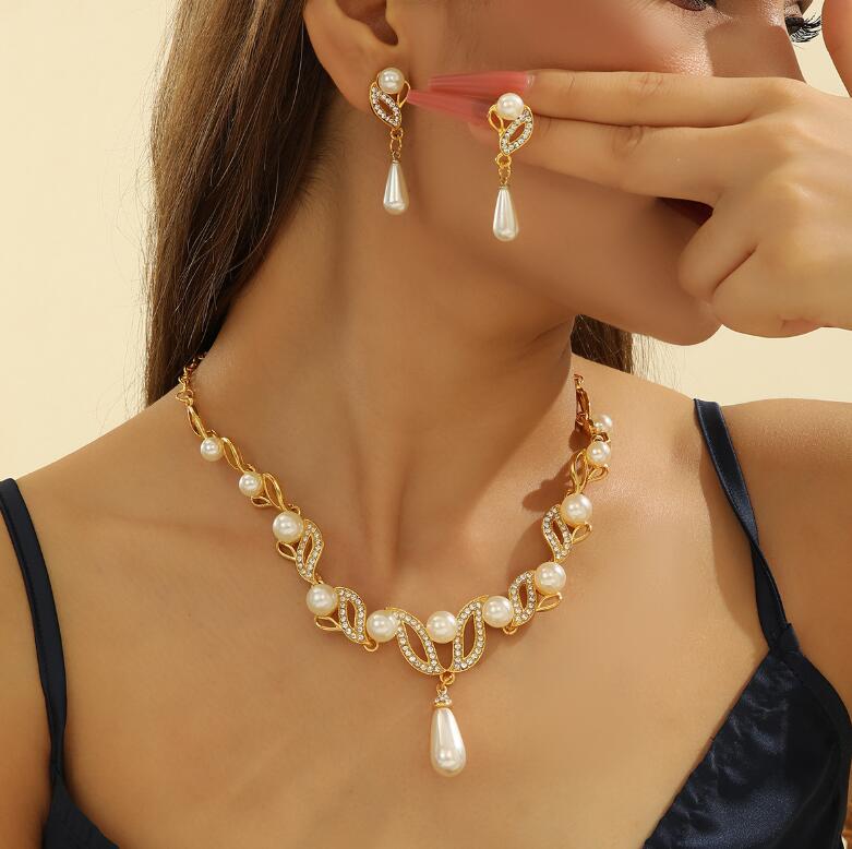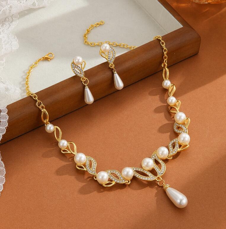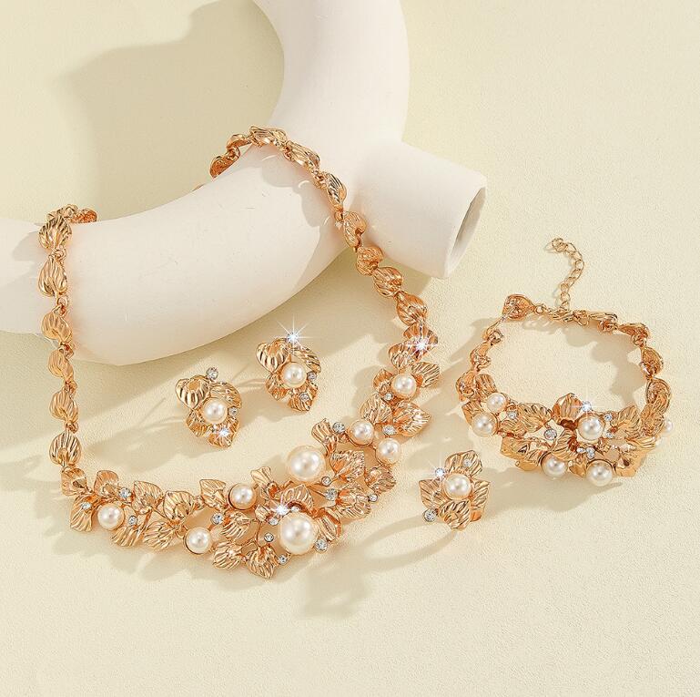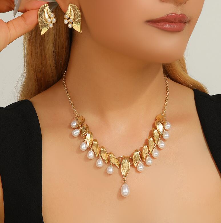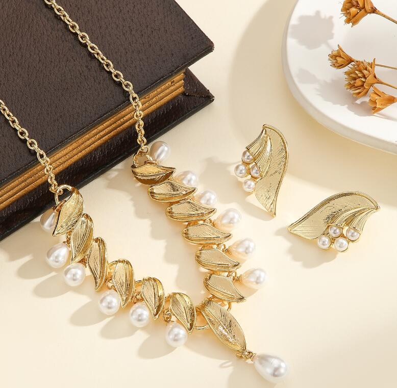 Best-selling retro imitation pearl diamond-encrusted leaf and flower necklace set