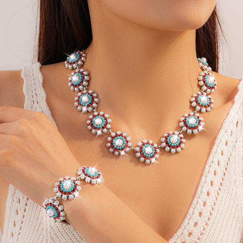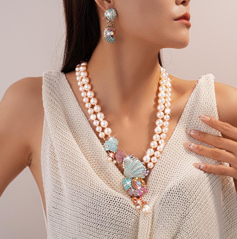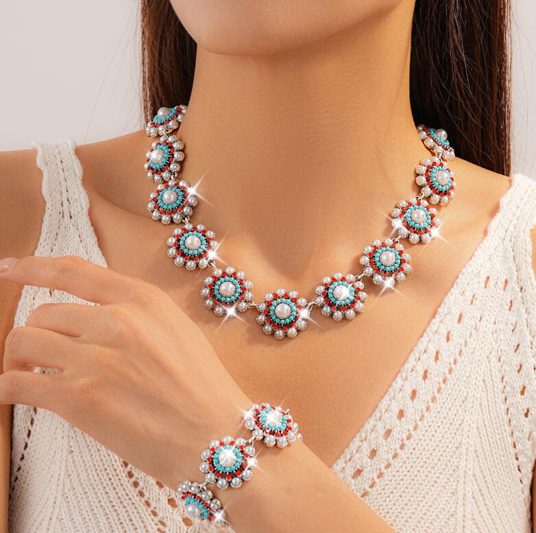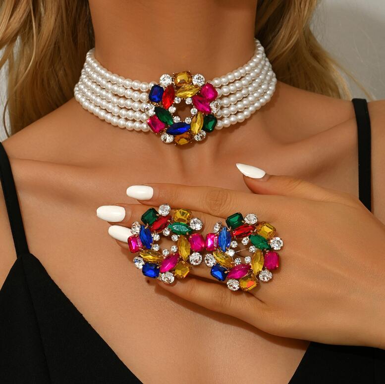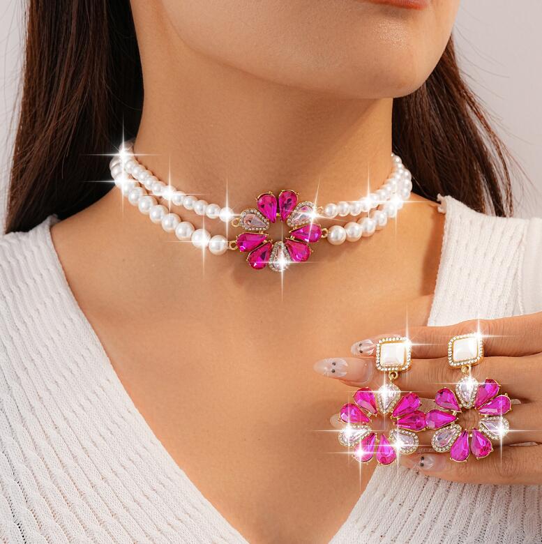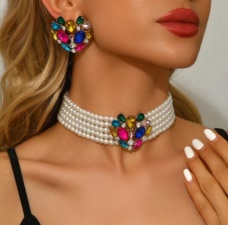 Geometric multi-layered pearl necklaces and earrings colorful crystal floral necklaces