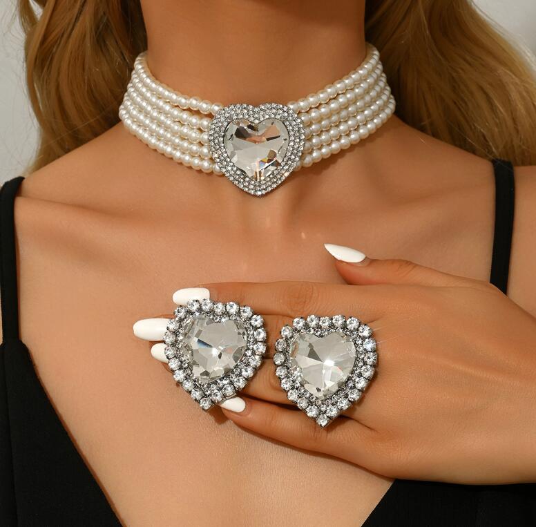 New trendy multi-layer imitation pearl heart-shaped crystal necklace and earrings set collar chain