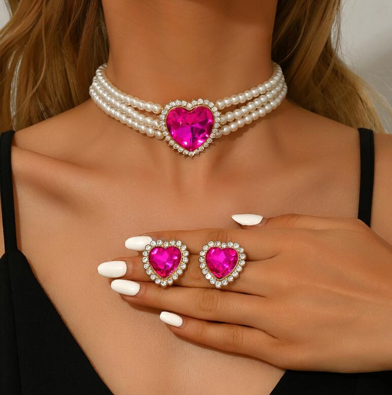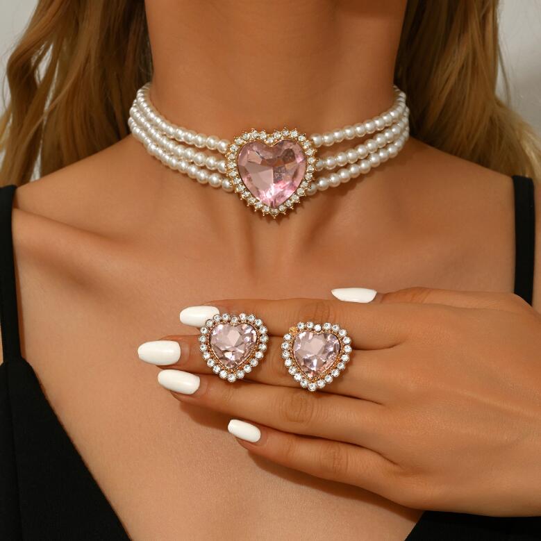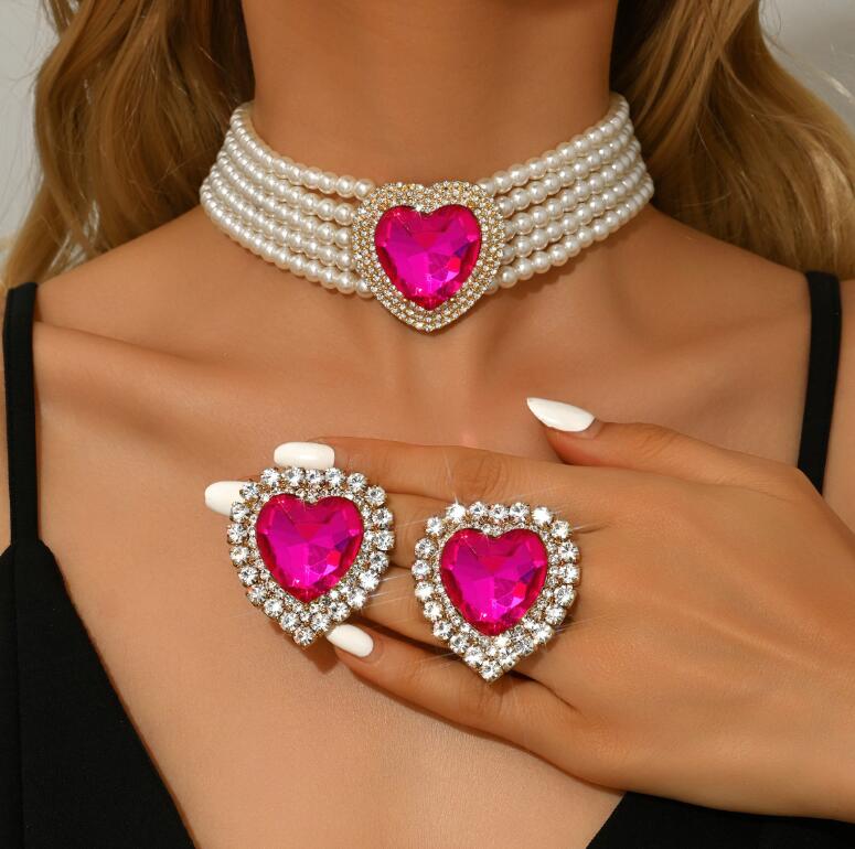 Excessively multi-layer imitation pearl heart-shaped glass earrings and necklace sets for formal events