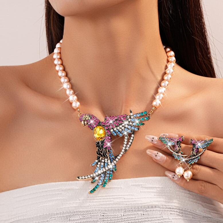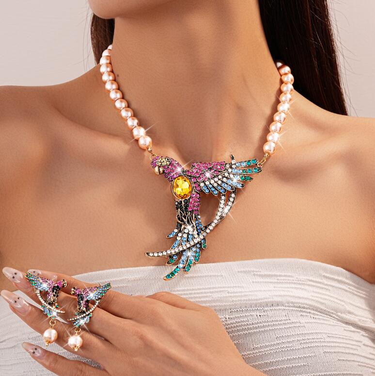 Parrot wing pearl earrings necklace set retro collar chain luxurious neck accessory for women