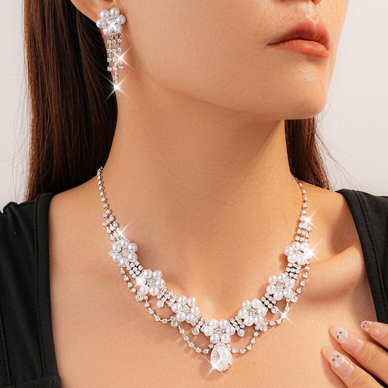 Diamond-studded pearl flower drop earrings and necklace set luxury neck accessory for women